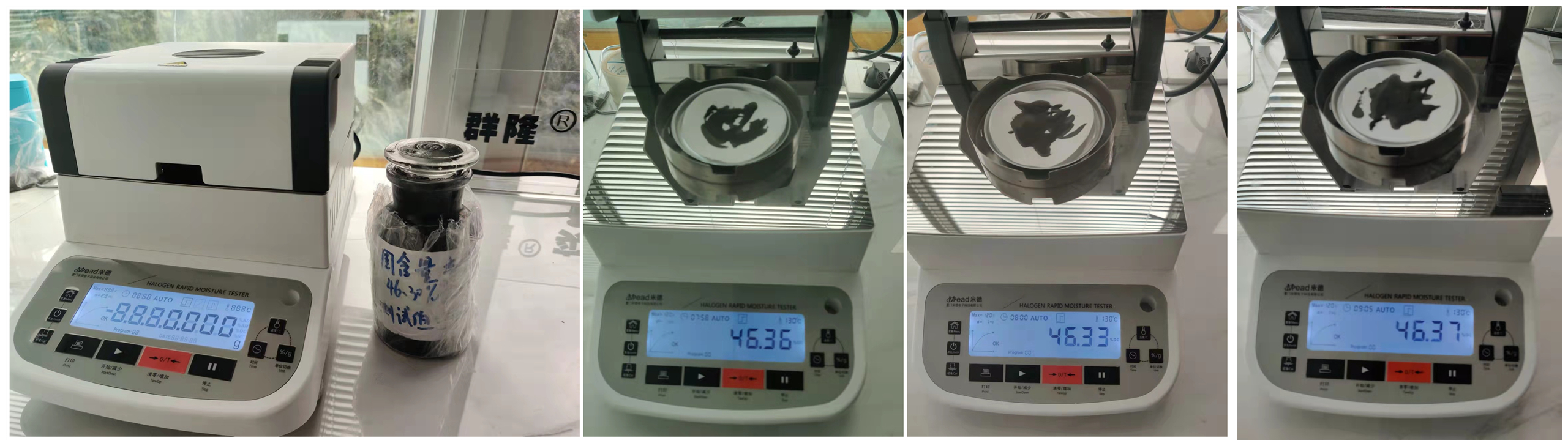 - 用實驗匙取適量漿料均勻涂在玻璃纖維紙上,設(shè)置好合適的溫度后蓋下上蓋,按下“START”鍵開始測試;蜂鳴兩聲后,儀器自動停機,測試結(jié)束,可在液晶顯示屏查看被測樣品的固含量為46.36%;